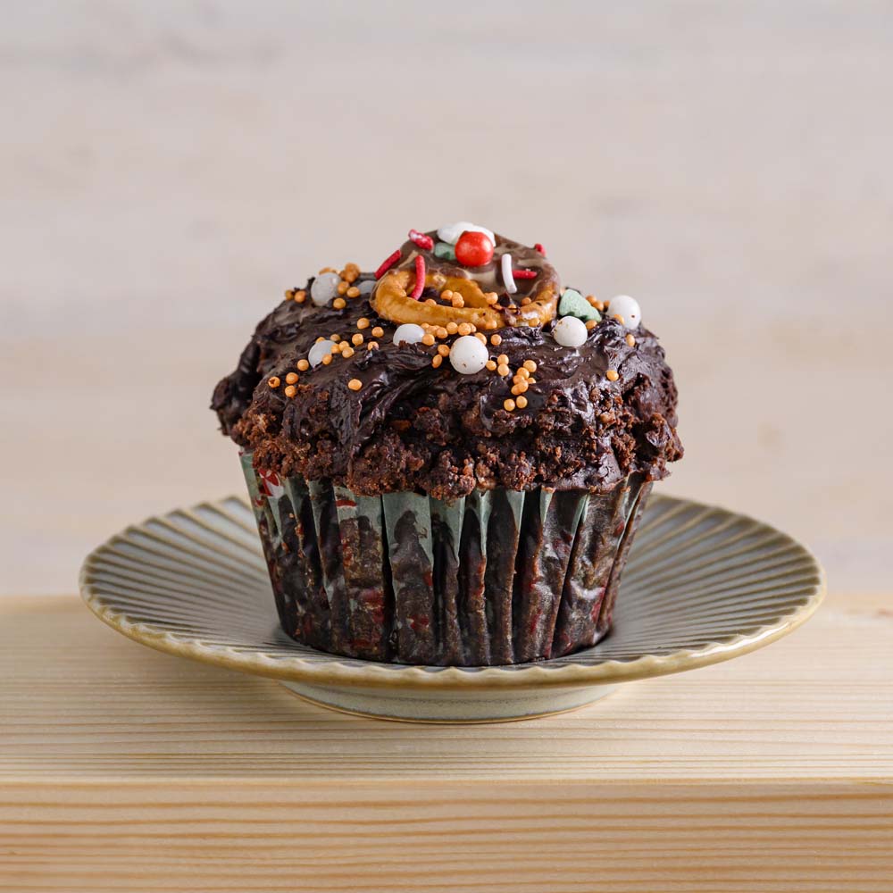 Puha, szaftos kovászos muffin prémium kakaóval és minőségi csokoládédarabokkal.